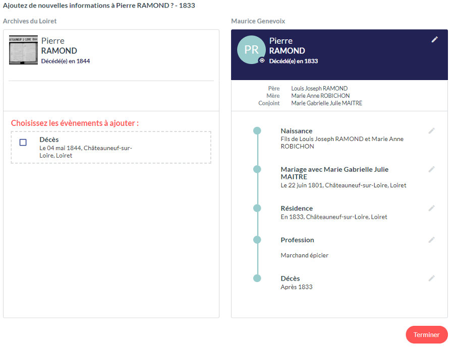 Filae vous donne la possibilité d’ajouter un événement à une fiche. Sur la page de consultation d’une archive, remarquez à gauche dans la transcription une icône pour ajouter la personne et l’événement.
