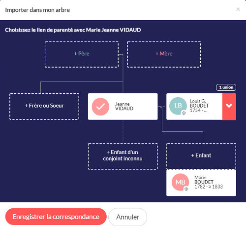 - Si vous avez un écran qui affiche la personne et sa parenté proche, cliquez sur la personne, normalement au centre de l’écran puis cliquez sur Enregistrer la correspondance.