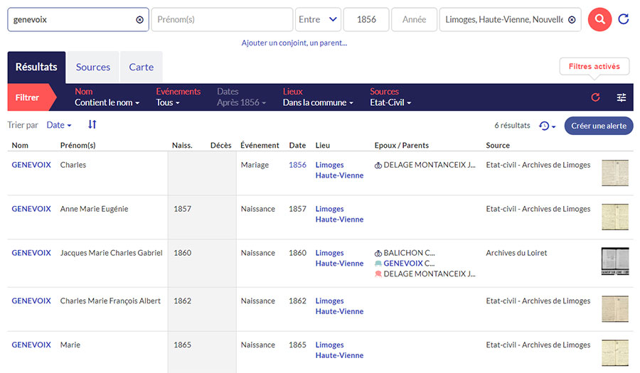 Ses grands parents se sont mariés le 15 septembre 1856 à Limoges. Nous recherchons donc des actes concernant des GENEVOIX à Limoges à partir de 1856. Vous pouvez consulter l'article "Trouver les frères et sœurs de vos ancêtres".