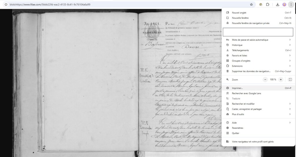 Maintenant, en cliquant sur l’icône de l’imprimante en haut à droite, l’image de l’archive s’ouvre dans un nouvel onglet. Sur un smartphone ou une tablette, il faut cliquer en haut à droite de l’écran sur les 3 points puis vous cliquez sur l’icône de l’imprimante.