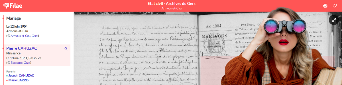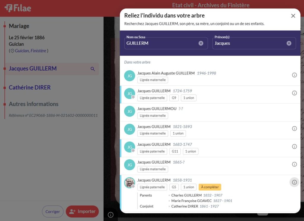 À droite de chaque personne, cliquez sur le cercle avec le ‘i’. Filae vous précisera alors les parents et le ou les conjoints de la personne, facilitant ainsi le choix de la personne à sélectionner.