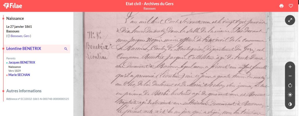 Comme précédemment les icônes à droite, vous permettent de zoomer, d’effectuer une rotation (pratique pour lire les mentions marginales écrites à la verticale), de modifier la luminosité et de mettre l’image en négatif ce qui aide parfois à mieux voir les écritures.