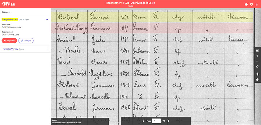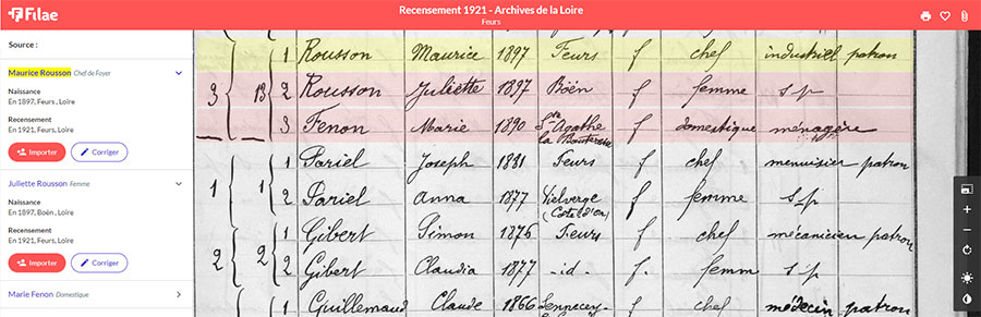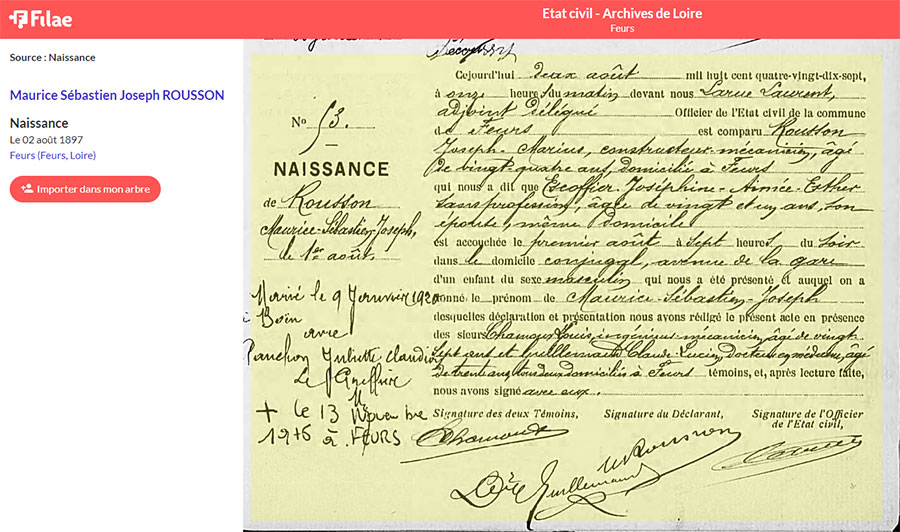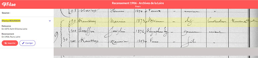 Une recherche du nom de famille Rousson à Feurs fournit actuellement 37 résultats sur Filae avec des actes d’état civil, des recensements de 1906, 1921 et 1931 ainsi des décès du fichier de l’INSEE.