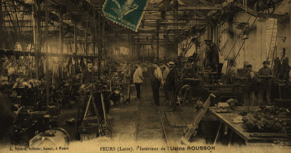 La carte postale du début du XXe siècle témoigne de l’histoire industrielle de Feurs dans la Loire. Nous découvrons l’intérieur de l’usine Rousson avec des ouvriers en plein travail. La légende ne précise pas ce que produit l’usine…