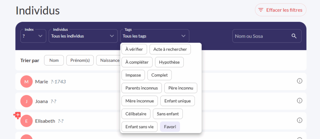 Il est possible aussi de limiter les individus à ceux qui ont un tag, une étiquette ajoutée, pour les retrouver plus facilement.