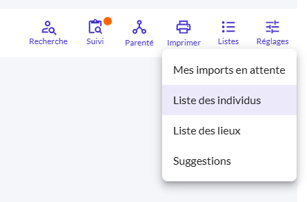 Une fois votre arbre à l’écran, la liste des individus est accessible par le menu Listes puis listes des individus. La liste vous donne toutes les personnes créées dans votre arbre généalogique.