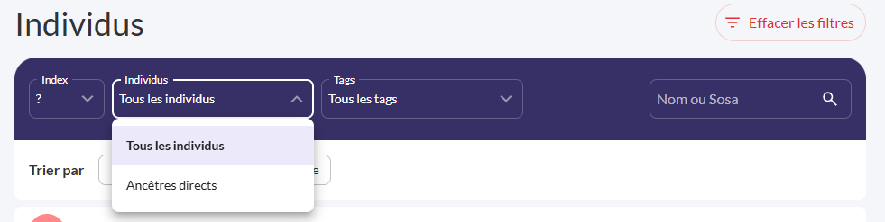 Le filtre individus peut limiter l’affichage aux ancêtres directs, les ancêtres du sosa 1.