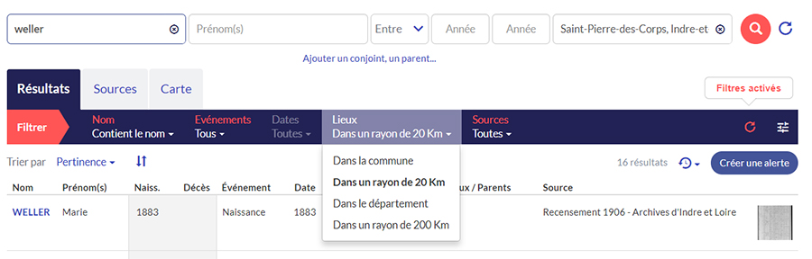 Grâce à la carte géographique, un seul coup d'oeil suffit pour visualiser la répartition géographique des résultats. Et si c'est un nom rare, vous pouvez rapidement trouver des ancêtres ou des collatéraux migrateurs !