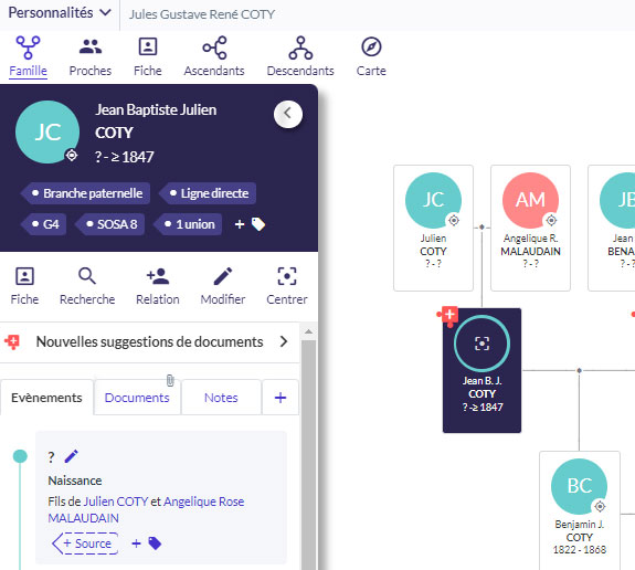 Enfin, cliquez dans le menu sur Suggestions pour trouver tous les individus qui ont des suggestions de documents et d’arbres, une aide bien pratique pour compléter votre généalogie.
