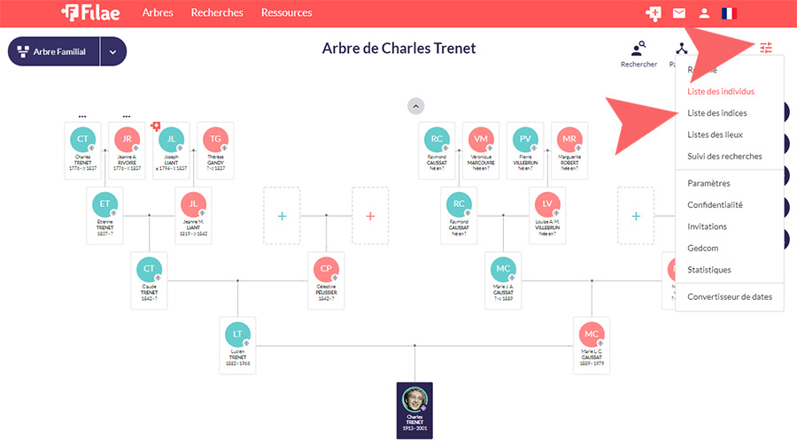 - Cliquez sur la personne souhaitée pour voir la fiche et l’arbre.