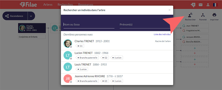On peut papillonner de branche en branche pour trouver un individu mais il existe des moyens plus simples. Vous avez déjà la recherche dans l’arbre :
