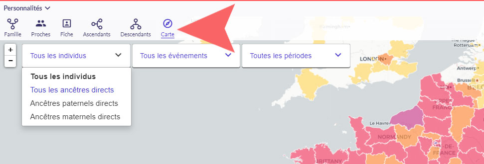 Grâce à la carte vous visualisez vos origines et vous avez accès aussi aux fiches des individus. Un clic sur un lieu et vous arrivez dans la liste des événements vous permettant de sélectionner une personne.