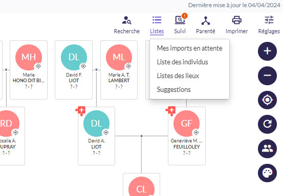 Chaque vue de l’arbre permet d’aller de fiche en fiche et de visualiser une branche de l’arbre comme la vue ascendants ou la vue Proches.