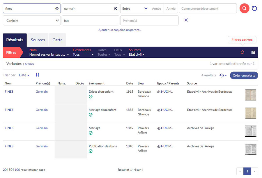 Un exemple ! Vous lancez une recherche sur vos ancêtres de l’Ariège, Germain Fines et Marie Huc. Vous trouvez bien le mariage à Pamiers en 1849 mais vous apprenez en même temps que leur enfant Jean s’est marié en 1888 à Bordeaux et que leur fille Magdeleine est décédée en 1915 dans la capitale girondine !