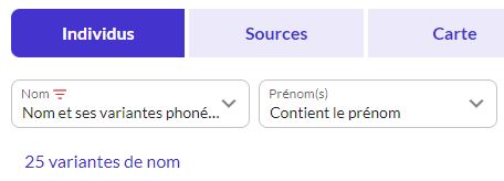 Lorsque vous activez le filtre « Nom et ses variantes phonétiques », le nombre de variantes disponibles est désormais affiché. Il vous suffit de cliquer dessus pour visualiser les variantes, comme c’était le cas auparavant. Vous avez également la possibilité de décocher celles qui ne vous intéressent pas.