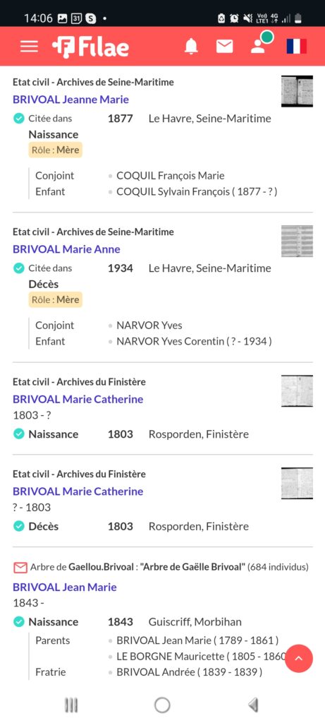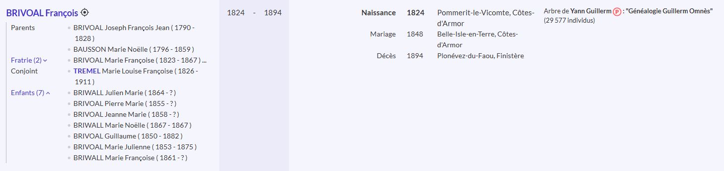 Concernant la fratrie et les enfants, le nombre de personnes est indiqué tout comme le nombre d’événement. Pour les arbres en accès direct, un clic et vous avez tous les détails directement dans le moteur de recherche !