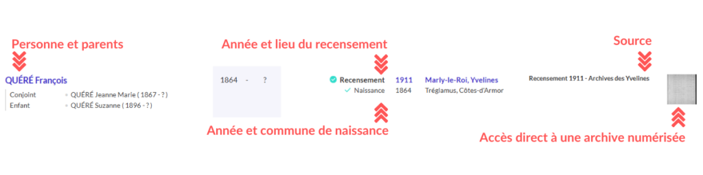 Davantage d’informations sont désormais visibles sur la page des résultats. Vous pouvez ainsi choisir plus rapidement les archives et les arbres qui vous intéressent, sans avoir à les ouvrir pour les consulter.