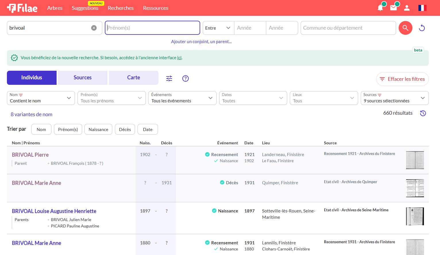 Désormais, Filae présente une ligne unique par source, quel que soit le nombre d’événements qu’elle contient. Vos recherches sont ainsi simplifiées et plus claires.