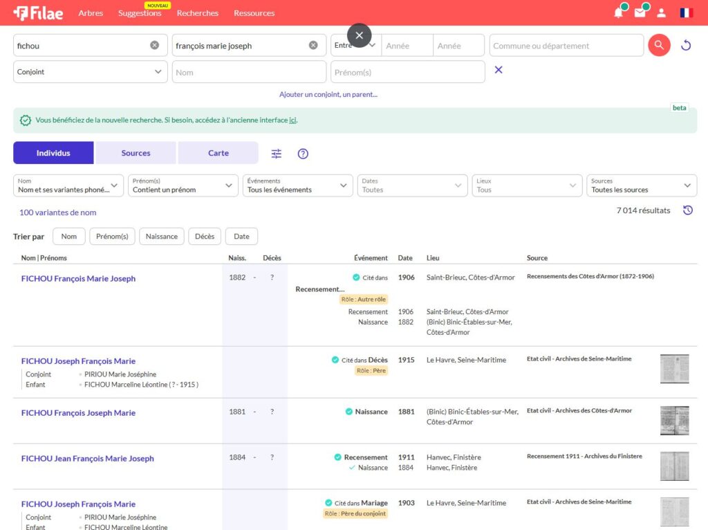 Auparavant, Filae affichait une ligne distincte pour chaque événement. Par exemple, une fiche d’arbre pouvait apparaître plusieurs fois, une pour chaque événement associé. De même, une source contenant plusieurs événements, comme un recensement mentionnant à la fois la résidence et la naissance, était affichée en double.