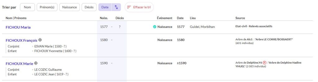 Par défaut, les résultats sont triés par pertinence, c’est-à-dire que les résultats les plus proches de votre recherche apparaissent en premier, notamment lorsqu’une personne porte plusieurs prénoms.