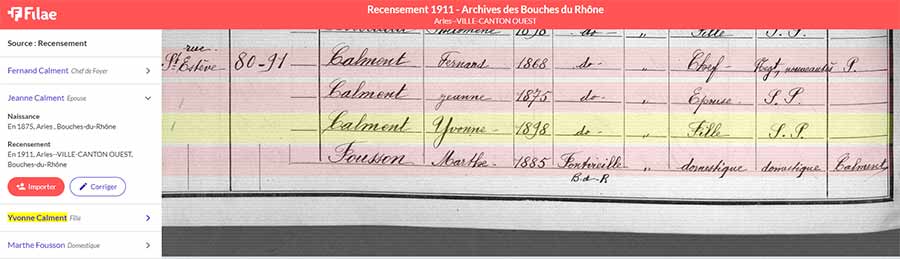 Elle a 36 ans lorsqu’elle est recensée en 1911. Elle réside avec son époux Fernand Calment, son cousin issu de germain qu’elle a épousé en 1896, leur fille Yvonne née en 1898 et une domestique Marthe Fousson.