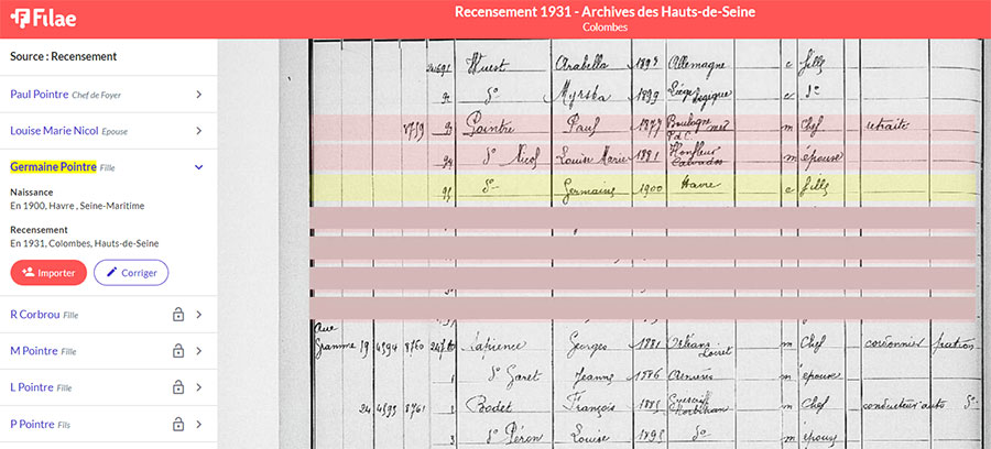 La famille a quitté la Normandie. En 1931, Ils résident maintenant à Colombes dans les Hauts-de-Seine. Germaine habite toujours chez ses parents. Le nom de famille a été écrit Pointre par l’agent recenseur !