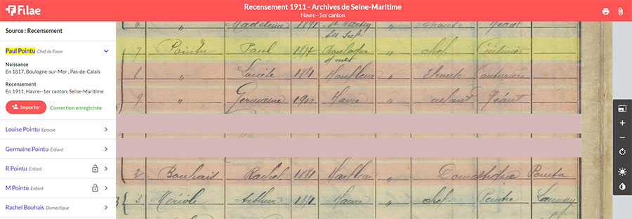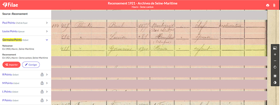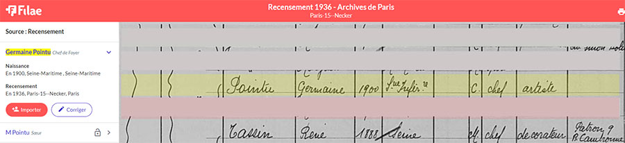 La famille a quitté la Normandie. Ils résident maintenant à Colombes dans les Hauts-de-Seine. Germaine habite toujours chez ses parents. Le nom de famille a été écrit Pointre par l’agent recenseur !
