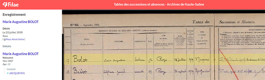 Avec l’ajout des tables de successions et absences de Haute-Saône, vous disposez maintenant de plus de 30 millions d’individus indexés, défunts et conjoints. Retrouvez des décès grâce à ces nouvelles indexations.