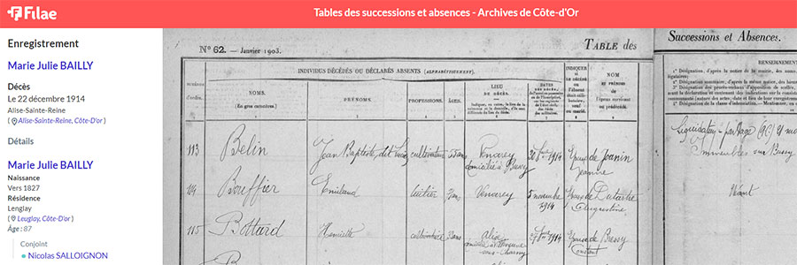 Les indexations des tables de successions et absences continuent avec cette fois-ci, le département de la Côte-d’Or. Une recherche nominative permet maintenant de retrouver un décès entre 1900 et 1969 et d’accéder directement à l’archive.