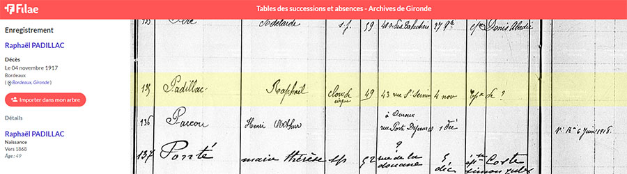 Nouvelle avancée dans l’indexation nominative des Tables de successions et absences avec le département de la Gironde. Lancez vos recherches et surveillez vos suggestions d’archives dans votre arbre !