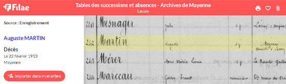 Après l’état civil (1793-début du XXe siècle), les registres paroissiaux (1700-1792) et les recensements (1872, 1906, 1911, 1921, 1931), découvrez les tables de successions et absences de la Mayenne de 1914 à 1968.