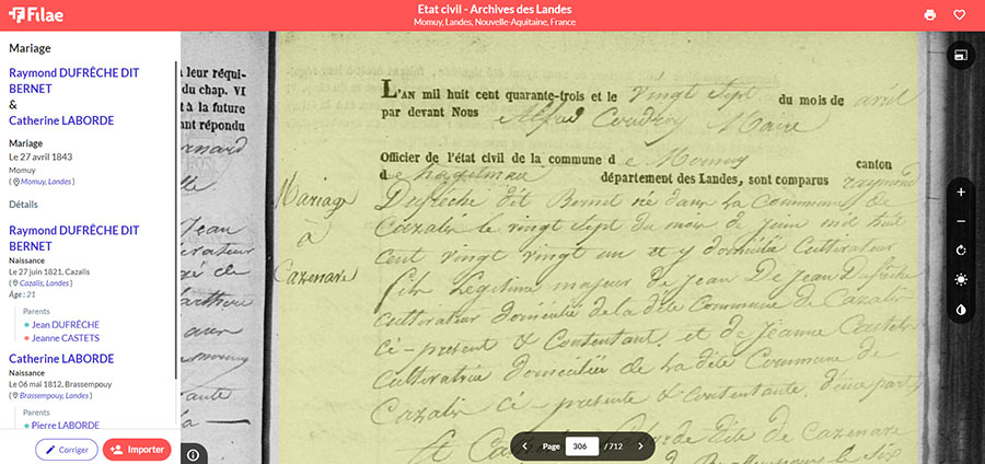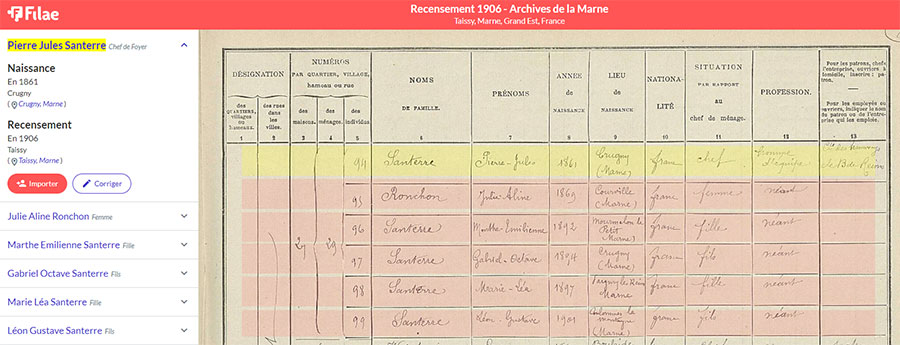 Les indexations filiatives de Filae et les relevés associatifs facilitent la recherche des enfants. Il suffit de chercher un couple pour obtenir les actes familiaux, notamment les naissances, mariages et décès. Consultez la FAQ pour connaître les départements et villes enrichis des noms des parents.