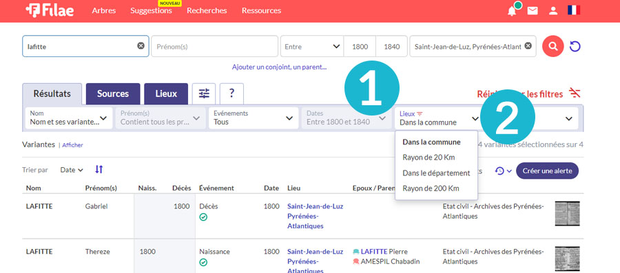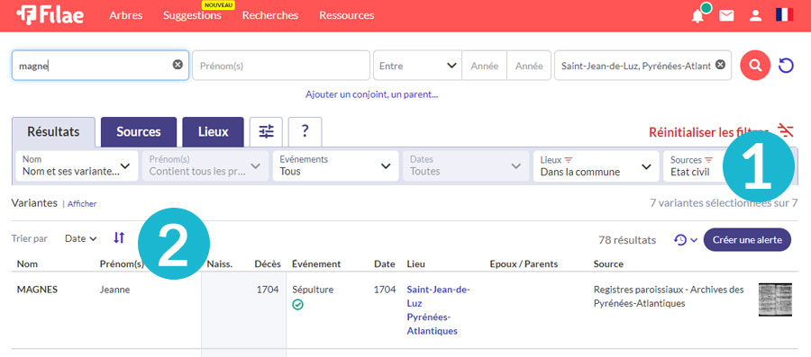 Lors de la recherche sur un patronyme dans une commune, sélectionnez uniquement les actes d’état civil (1) et classez les actes par date (2) pour établir une chronologie des événements. Consultez chaque acte pour vérifier les détails sur les parents et déterminer s’il s’agit bien d’un enfant du couple recherché.