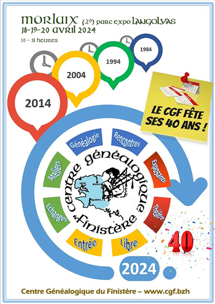 Le Centre Généalogique du Finistère fête ses 40 ans et organise à cette occasion un salon de généalogie les 18, 19 et 20 avril 2024 à Morlaix.